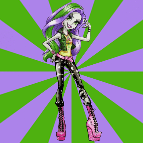Moanica Decay, a Monster High G1 zombie character, stands against a vibrant purple and green striped background.
