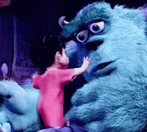 Boo shares a tender hug with Sully, the big blue monster, in a heartwarming moment from Monsters Inc.