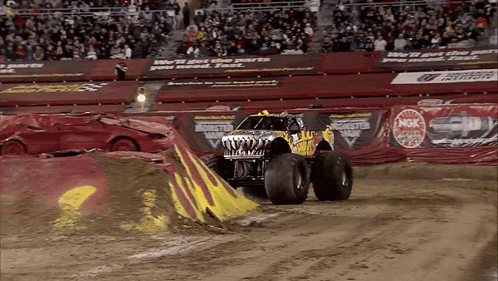 a monster truck is driving down a dirt track in front of an ad for ngk