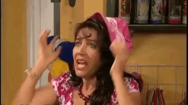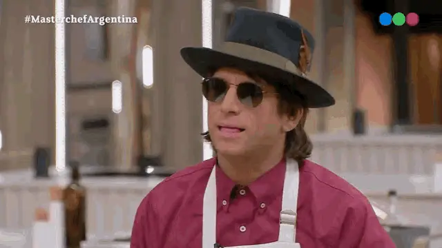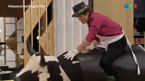Joaquín Levinton rides a mechanical bull on Masterchef Argentina, wearing a hat and apron.