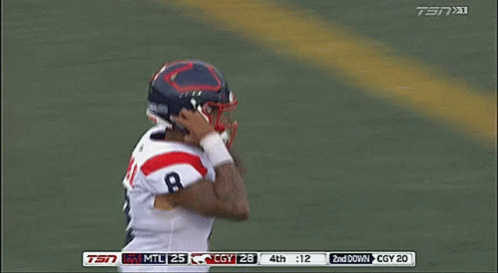 Montreal Alouettes quarterback Vernon Adams Jr. briefly removes his helmet during a CFL game, number 8.