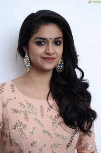 A beautiful woman with a bindi, wearing an elegant peach embroidered dress, smiles warmly for the camera.