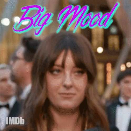 A woman smiles as the words 'Big Mood' appear above her, accompanied by the IMDb logo.