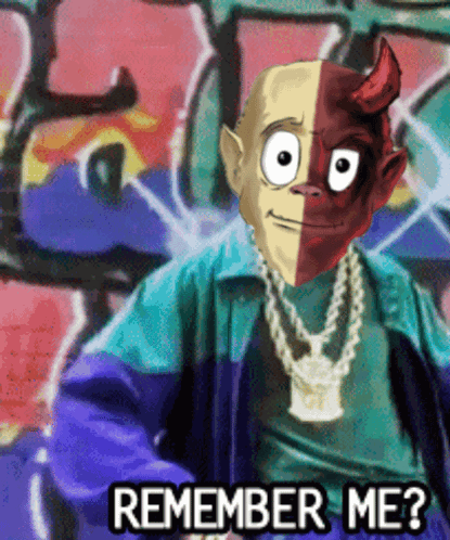 A cartoon character, Moodymights Cryptomaze, with a split face (half Gorillaz 2D, half devil) asks 'Remember me?' in front of graffiti.