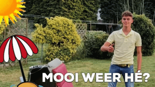 Young man in yellow shirt gives thumbs-up in a sunny garden with cartoon summer items and Dutch text 'Mooi Weer Hé?'.