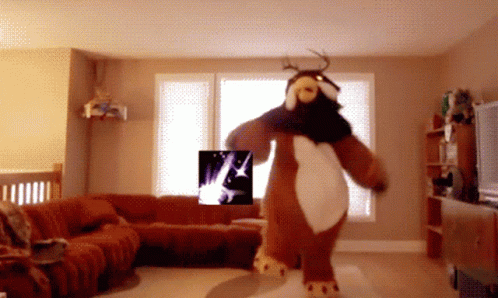 A person in a Moonkin costume performs a lively dance in a cozy living room.