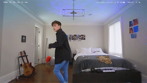 Johnny Orlando performs a smooth moonwalk dance in his bedroom, with a keyboard and guitar visible.