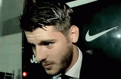 Morata looking down in a suit and tie, with a Nike logo visible in the background.