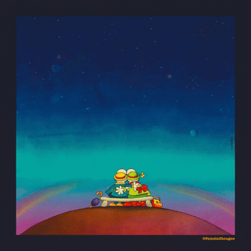 Mordillo and Pamela Chougne's artwork depicts a couple gazing at a magical night sky filled with stars, moons, and hearts.