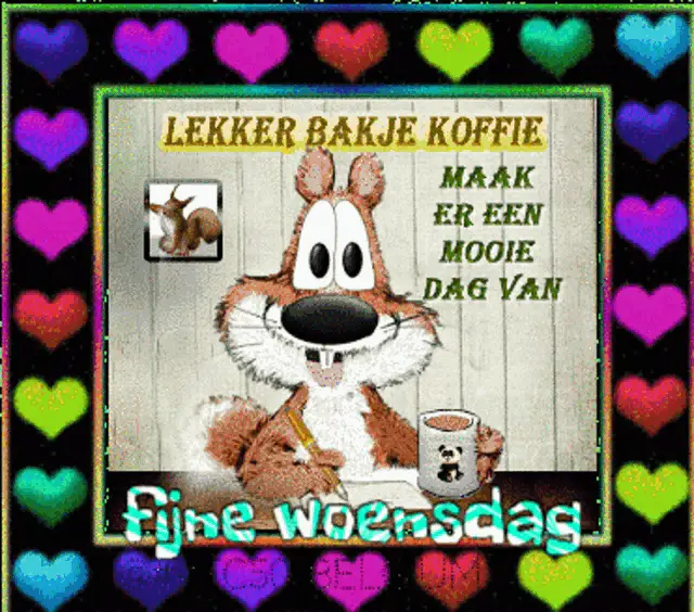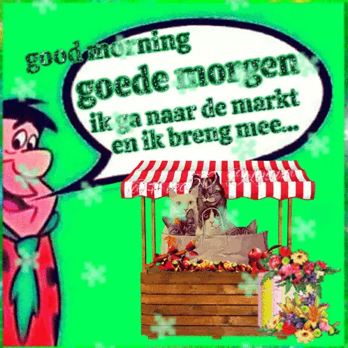 Animated cartoon cow with big pink lips wishing good morning, serving coffee next to a ginger cat.