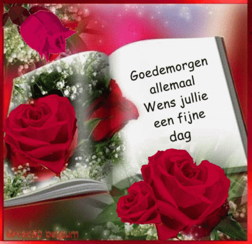Morgend Vec50 presents a beautiful good morning greeting with red roses and an open book displaying a Dutch message.
