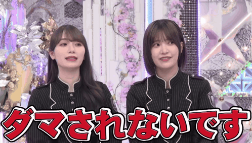 a couple of girls standing next to each other with chinese writing on the bottom right