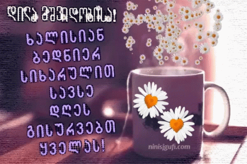 A cozy purple mug adorned with chamomile daisies, steaming gently, accompanied by a warm Georgian good morning message.
