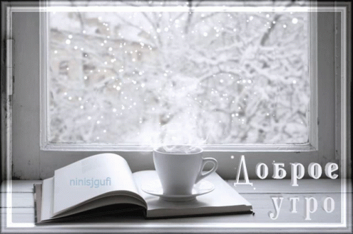 Ninisjgufi enjoys a peaceful good morning with a steaming cup of coffee and a book by a snowy window.