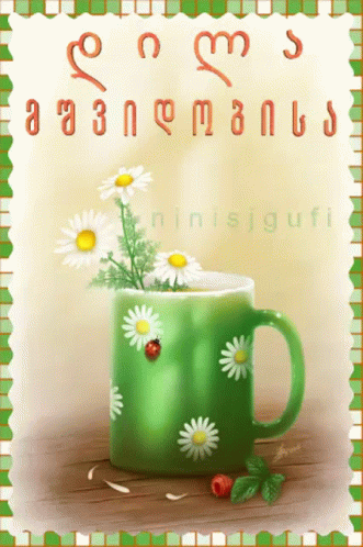 Green mug with daisies and a ladybug on a wooden table, featuring a 'Good Morning' greeting.