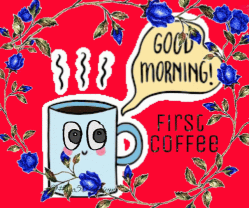 Animated coffee mug with a cute face, steam, and 'Good Morning! First Coffee' text, framed by blue roses.