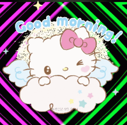 Hello Kitty on a cloud with wings, wishing 'Good morning!' against a vibrant background.