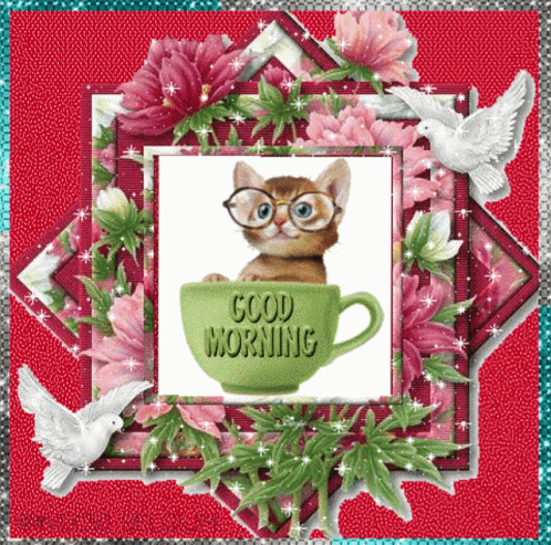 A cute kitten wearing glasses peeks from a green cup with 'Good Morning' written on it, surrounded by flowers.