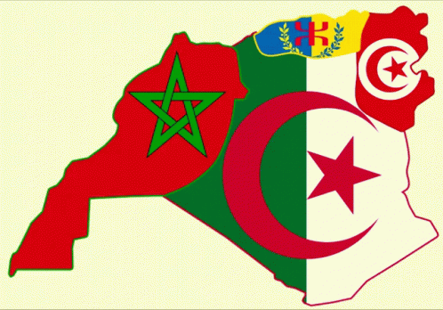 Map of North Africa featuring the flags of Morocco, Algeria, Tunisia, and the Berber flag.