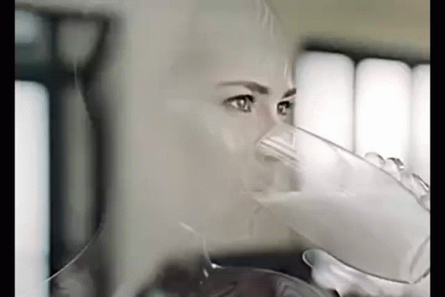 A woman drinks from a glass, appearing to morph and become partially invisible in this black and white clip.