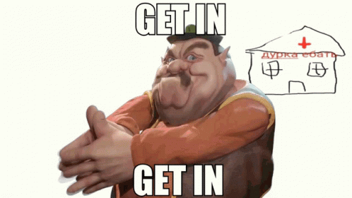 Morshu meme character points to a 'crazy house' and repeatedly says 'GET IN'.