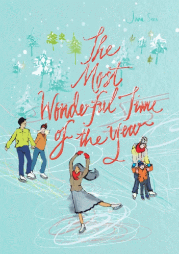 Festive illustration of people ice skating, celebrating "The Most Wonderful Time Of The Year" with snow and winter cheer.