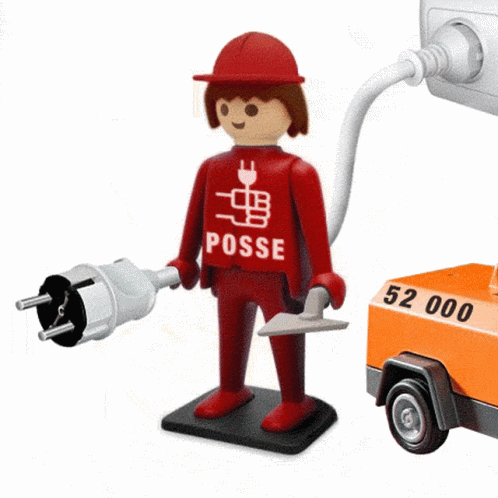 Playmobil-style figure in red uniform holding a large electric plug, with 'POSSE' on shirt.