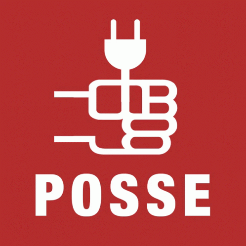 A red background with a white logo featuring a fist holding an electrical plug and the word 'POSSE', with a kiss mark appearing.