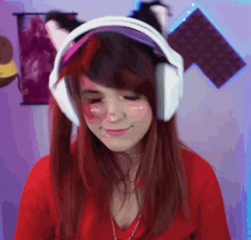 Motfrais performs a bailecito, smiling and shaking her head while wearing cat ear headphones and a red shirt.