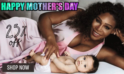 A woman and her baby on a bed, promoting a 'Happy Mother's Day' hair sale with 25% off.