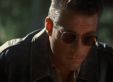 Jean-Claude Van Damme on a motorcycle, kicking up dust and performing a stunt in a wooded area.