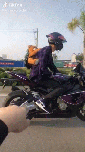 A biker rides a purple motorcycle with a teddy bear backpack, filmed from another vehicle on a sunny day.