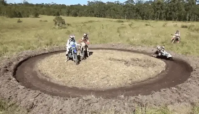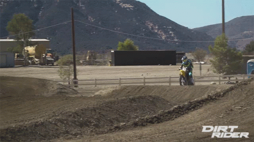 A motocross rider performs jumps and rides a dirt bike on a track, showcasing speed and skill.