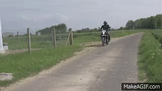 A man in full biker gear rides a motorcycle down a dirt road, then brings it to a stop.
