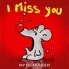 A cute cartoon mouse with a red nose blows a kiss on a red background with 'I miss you' text.