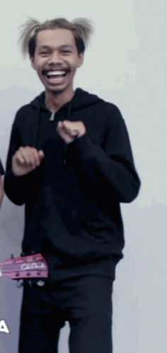 A man with spiky hair and a mustache smiles and dances happily while holding a small, pink guitar-like object.