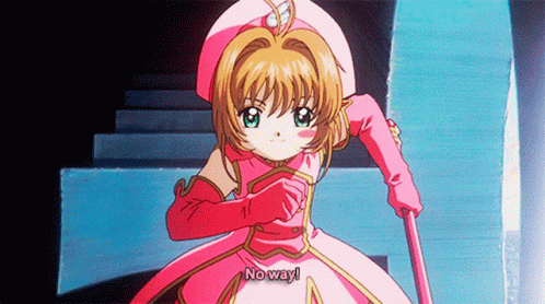 Cardcaptor Sakura, in her iconic pink battle costume, energetically runs forward, exclaiming 'No way!'