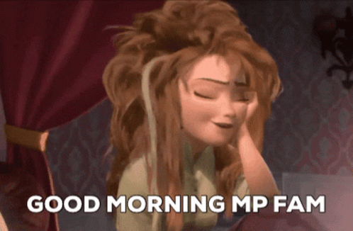 A cartoon character, resembling Anna from Frozen, wakes up with messy hair, wishing 'Good Morning MP Fam'.