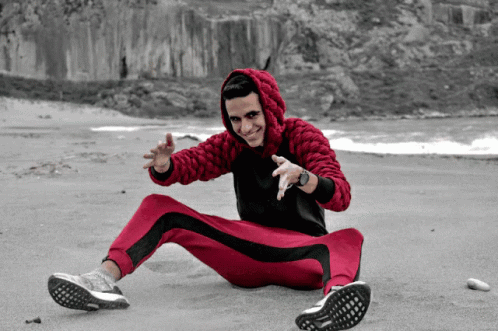 Kouloulias smiles, holding a large purple eggplant while sitting on a sandy beach in a red hoodie.