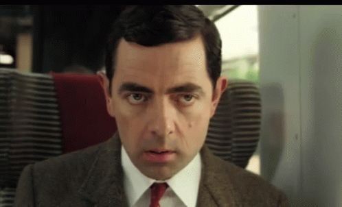 Mr. Bean looks intensely at the camera while on a train, wearing a suit and tie.