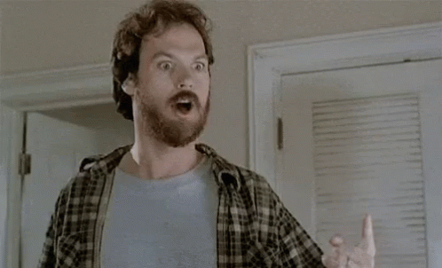A man from the movie Mr. Mom, with a beard, points his finger and exclaims 'I'm losing it'.