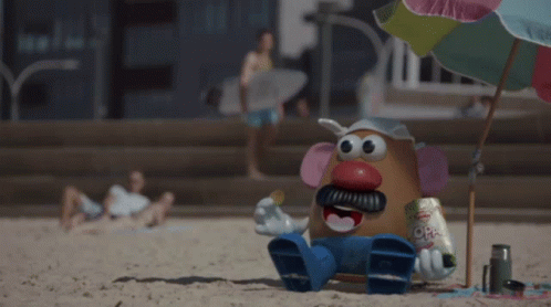 Mr Potato Head relaxes on the beach, enjoying a bag of Smiths chips under a colorful umbrella.