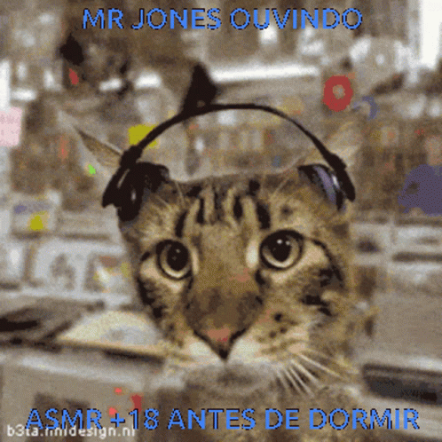 Mr. Jones, the cat, listens to ASMR +18 before sleeping, wearing headphones.