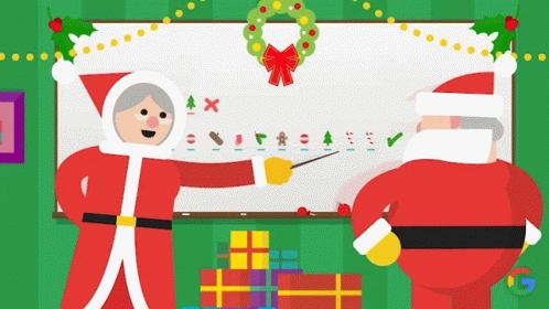 Mrs. Claus teaches Santa a festive lesson, pointing out Christmas items on a whiteboard.