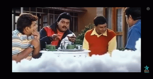 MS Narayana reacts with surprise while conversing with friends over tea.