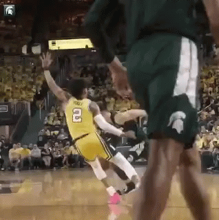 Jordan Poole of Michigan executes a slick crossover move on Matt McQuaid of Michigan State, leading to a basket.
