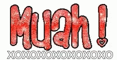 Glittery red text animation spelling 'Myah!' with a heart, followed by 'XOXOXOXOXOXO'.