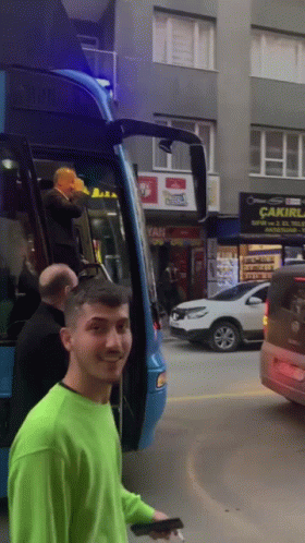 Muharrem Ince, a Turkish politician, is seen stepping out of a blue bus onto a city street.