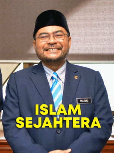 Mujahid Yusof Rawa, a Malaysian politician, smiles wearing a songkok and suit with 'Islam Sejahtera' text.