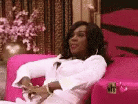 A woman in a white outfit collapses from a pink chair, exclaiming 'I am very weak' as she falls to the floor.